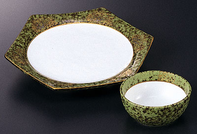 グリーンたたき金彩武蔵野六角6.5皿